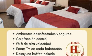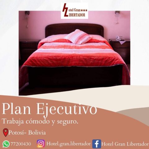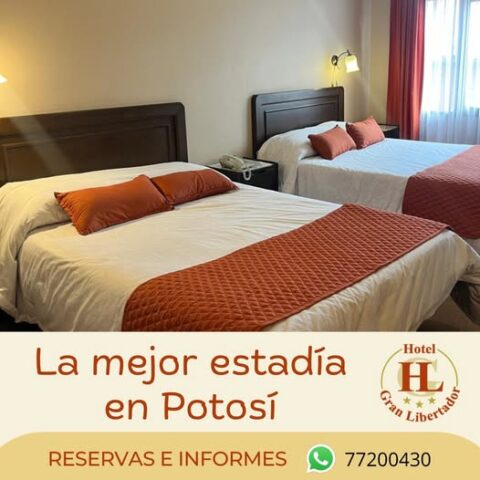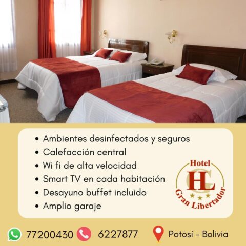 HOTEL GRAN LIBERTADOR Abierto Gerente General: Lic. Patricia Mendieta Ossio 0.0 0 Ratings Hoteles y hospedajes Hotel Gran Libertador Ver El Video Agregar Revisión Agregar a favoritos Compartir Compartir: Descripción Somos un hotel céntrico y confortable. Si visitas Potosí por turismo, trabajo o negocios somos la mejor opción. Informes y reservas: https://wa.me/59177200430 Nuestra dirección: Calle Millares No 58 WhatsApp: 77200430 6227877 – 6223470 Galería Video https://www.redtravelbolivia.com/wp-content/uploads/2021/10/video-gral-fb.mp4 Las comodidades Accepts Credit Cards Protocolos de bioseguridad Resturante Comentarios 0.0 0 clasificación 5 estrellas 0 4 estrellas 0 3 estrellas 0 2 estrellas 0 1 estrellas 0 Todavía no hay comentarios. Respuesta a los comentarios Cancelar la respuestaNombre Correo electrónico Sitio web *No obligatorio Guarda mi nombre, correo electrónico y web en este navegador para la próxima vez que comente. Sé el primero en opinar Cancelar la respuesta Califica nuestros serviciosSu Clasificación Su puntuación ComentarNombre Correo electrónico Sitio web *No obligatorio Guarda mi nombre, correo electrónico y web en este navegador para la próxima vez que comente. Cerca de Ubicación Obtener Indicaciones Hotel Gran Libertador libertador@entelnet.bo www.hotelgranlibertador.com Contactar por WhatsApp - Contacto De Negocio El Sujeto Su Correo Electrónico Su Mensaje Enviar Mensaje Otros Hoteles y hospedajes cercanos Encontrar más Hoteles y hospedajes cerca HOTEL GRAN LIBERTADOR